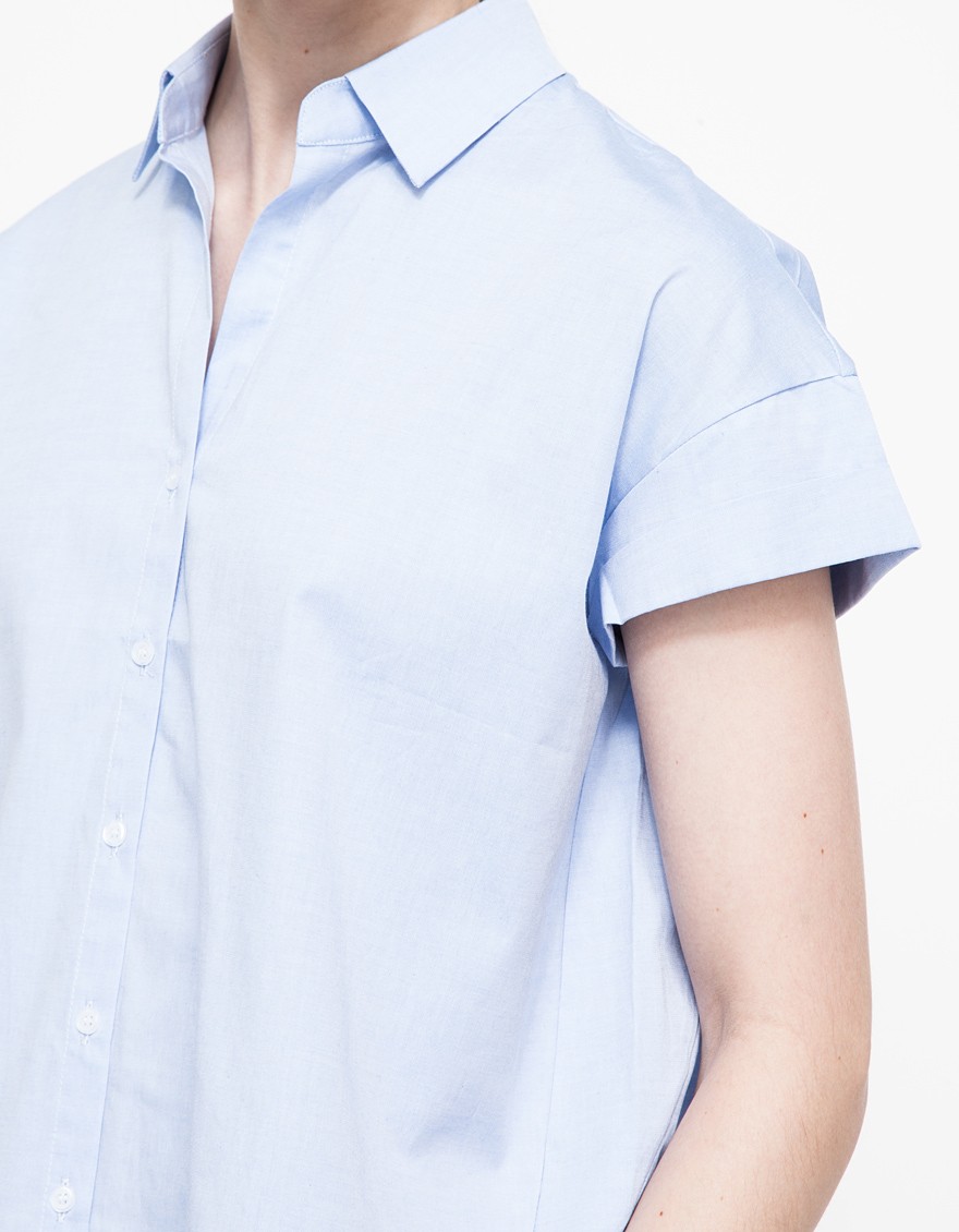From Stelen, a button front blouse with a geometric cut hemline. Features a rounded front hem, a longer back hem, cuffed sleeves, and a pointed collar with a relaxed, boxy fit.