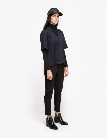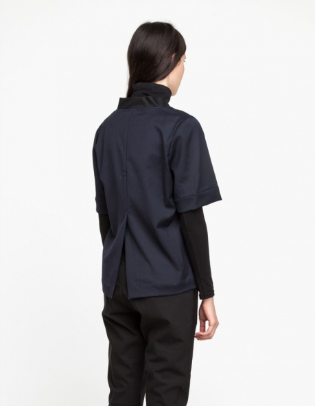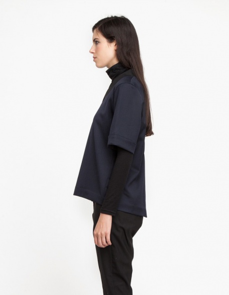 From Stelen, a button front blouse with a geometric cut hemline. Features a rounded front hem, a longer back hem, cuffed sleeves, and a pointed collar with a relaxed, boxy fit.